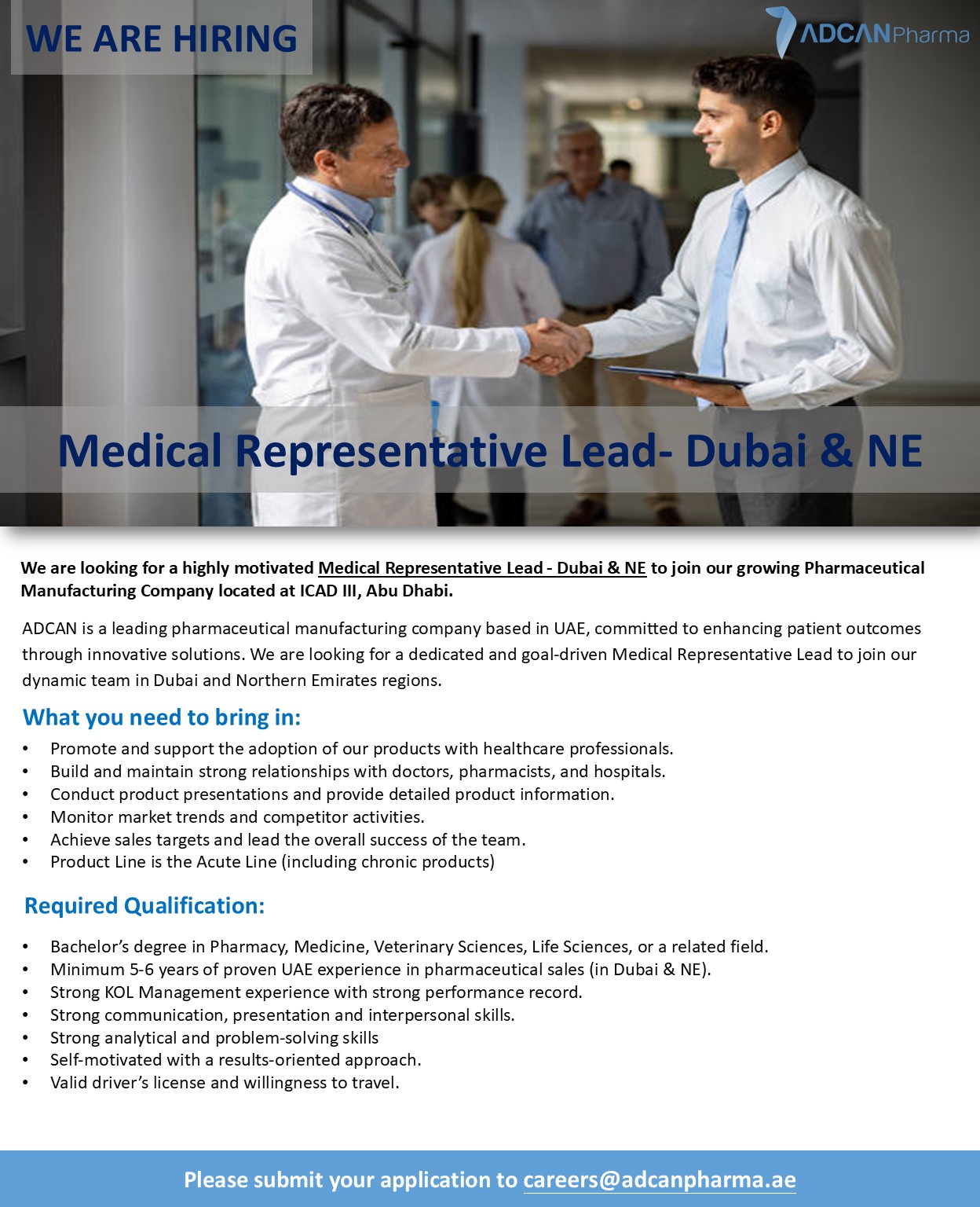Published in: Medical Representative Lead Author ADCAN Pharma Published on: March 11, 2026 Job Category: Sales Job Type: Full Time Job Location: Dubai Northern Emirates Apply for this position Full Name *Email *Phone *Cover Letter *Upload CV/Resume *Allowed Type(s): .pdf, .doc, .docxBy using this form you agree with the storage and handling of your data by this website. *
