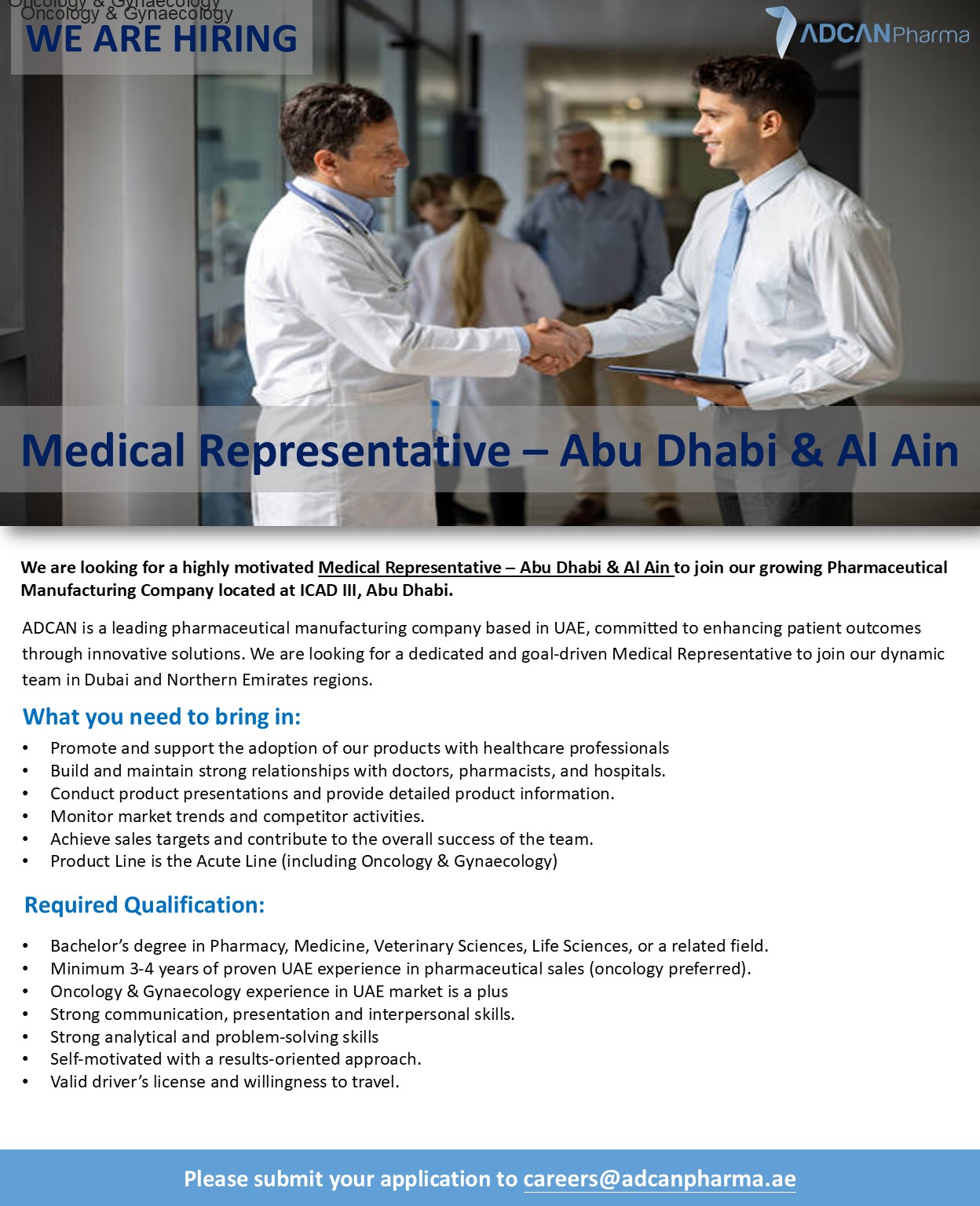 Published in: Medical Representative Oncology Gynaecology Author ADCAN Pharma Published on: March 11, 2026 Job Category: Sales Job Type: Full Time Job Location: Abu Dhabi Al Ain Apply for this position Full Name *Email *Phone *Cover Letter *Upload CV/Resume *Allowed Type(s): .pdf, .doc, .docxBy using this form you agree with the storage and handling of your data by this website. *